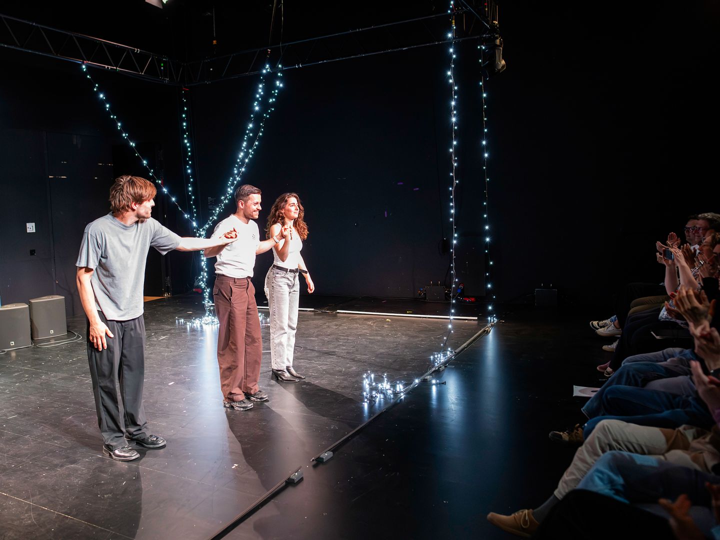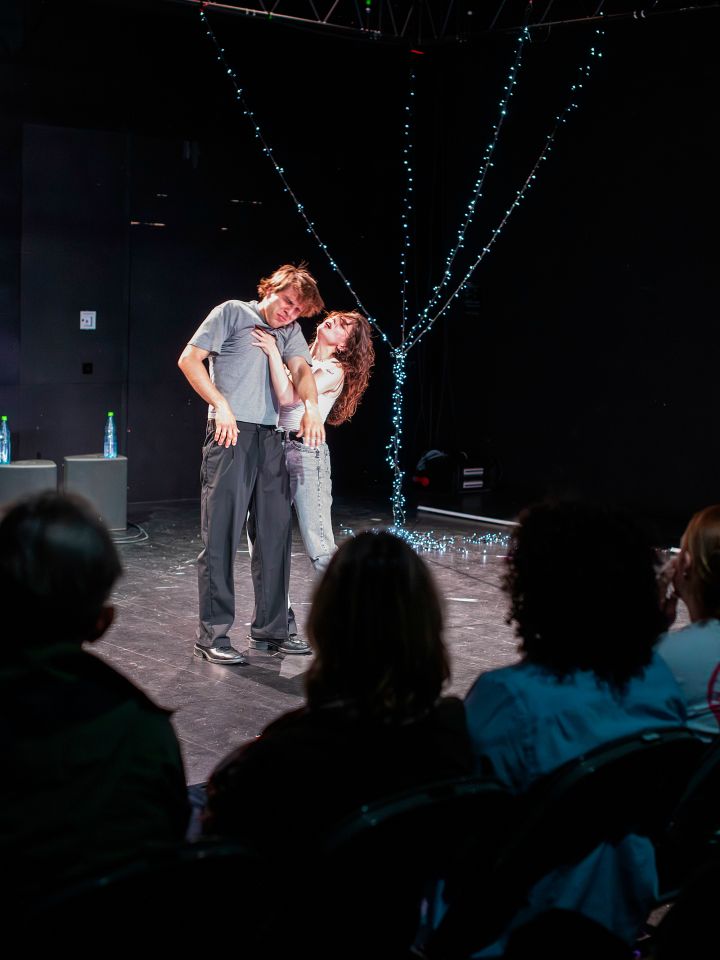 Damghani verhandelt das Provinzleben des Paares als ein Leben des Streits, der Liebe und des vergeblichen Verstehen-Wollens. Die schlichte Bühne, die der Szenograph Hugo Gretler nur durch vertikal herabhängende Lichterketten in einen Kontext des Wohnens einrahmt, lässt viel Raum für den eindrucksvollen Text und die Leistungen der zwei Schauspieler*innen Jonas Dassler und Aysima Ergün. Ihre Auseinandersetzungen werden zu einem Tanz voller Emotionen, Spontanität und Echtheit. Eine Echtheit, die sich im Raum niederlegt und Bilder des Alltags generiert. Denn die Diskussionen über die Wahl zwischen Widerstand und Sicherheit und die damit verbundenen Ängste sind nicht neu. Sie sind vielmehr so alltäglich, dass sie sich ins Hintergrundrauschen des Lebens einfädeln und von den akut schlimmen Dingen übertönt werden.